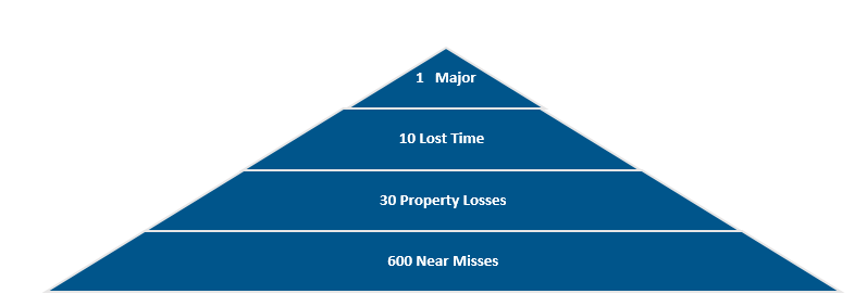 What the Incident Pyramid indicates is that for every 600 near misses, there are typically 30 property losses, 10 lost time incidents, and one major incident. The top three levels are part of the reactive process where an incident has already occurred. Investigation of serious incidents often reveal earlier incidents of a similar nature that were dismissed. Focusing on the lowest level can be part of the proactive process to make changes to health and safety measures that prevent occurrence of incidents.